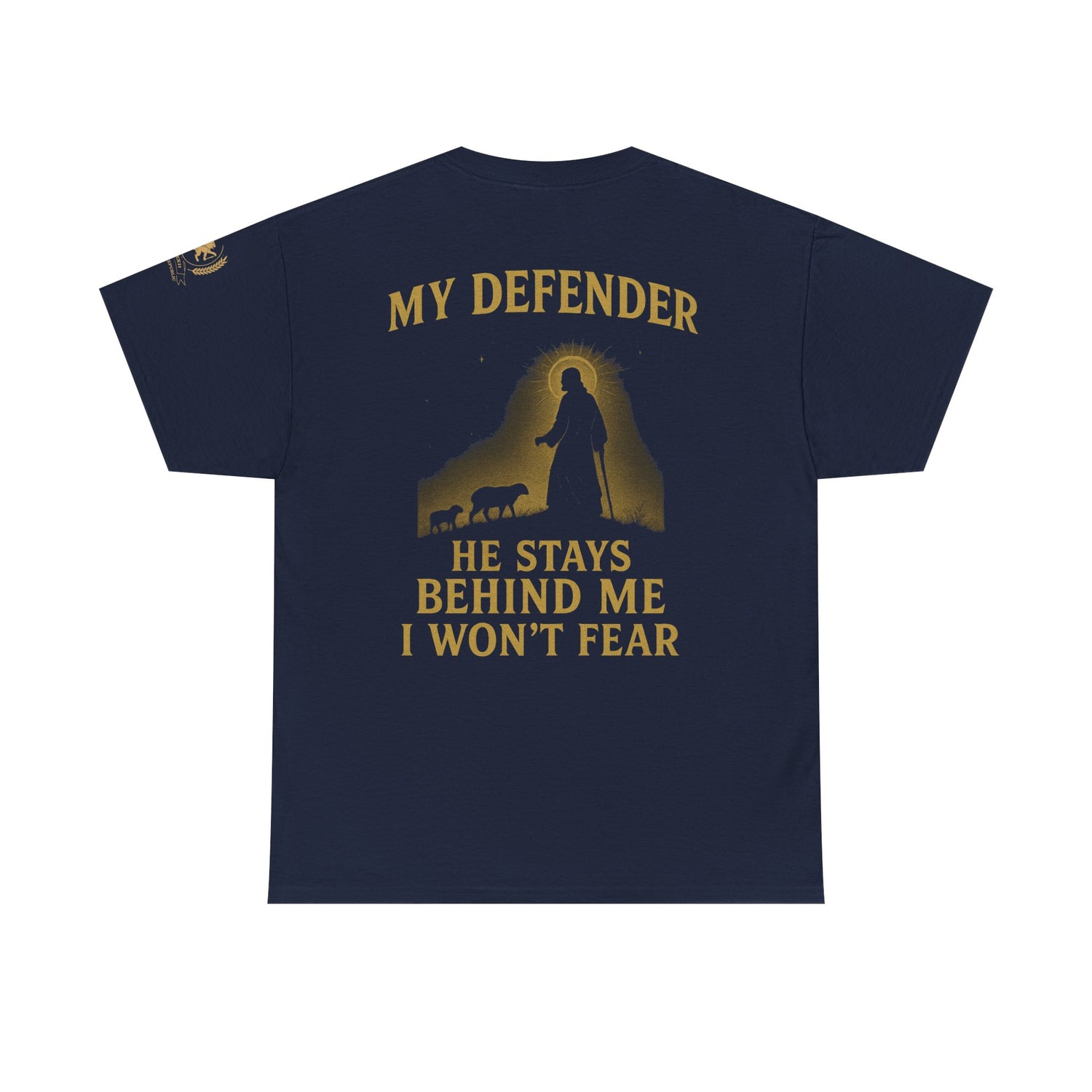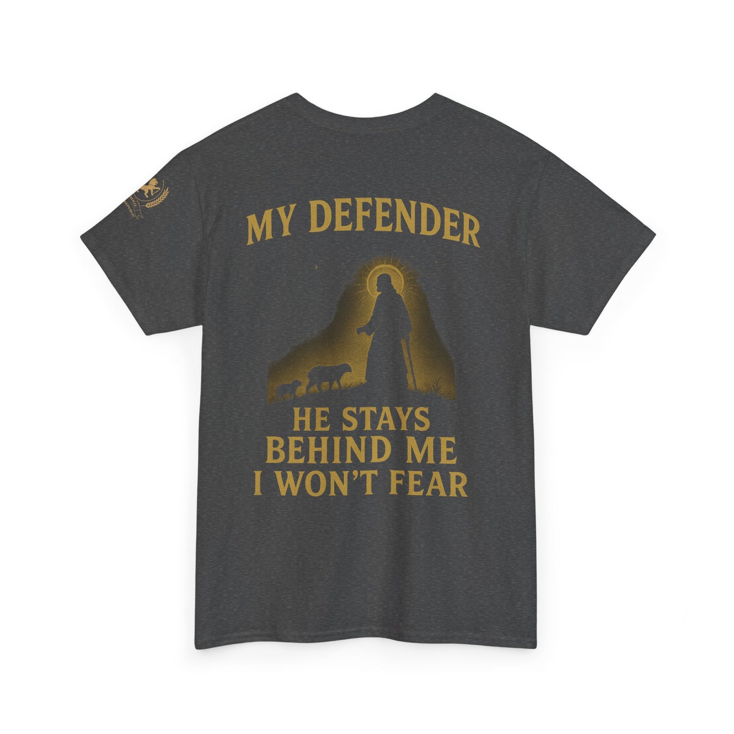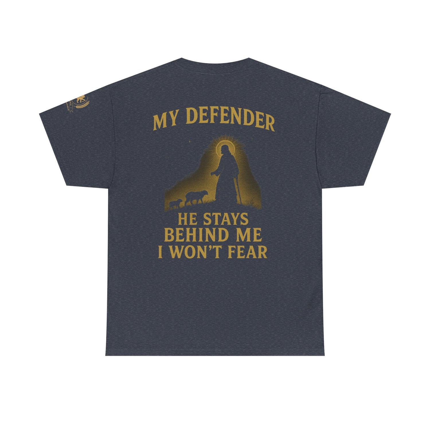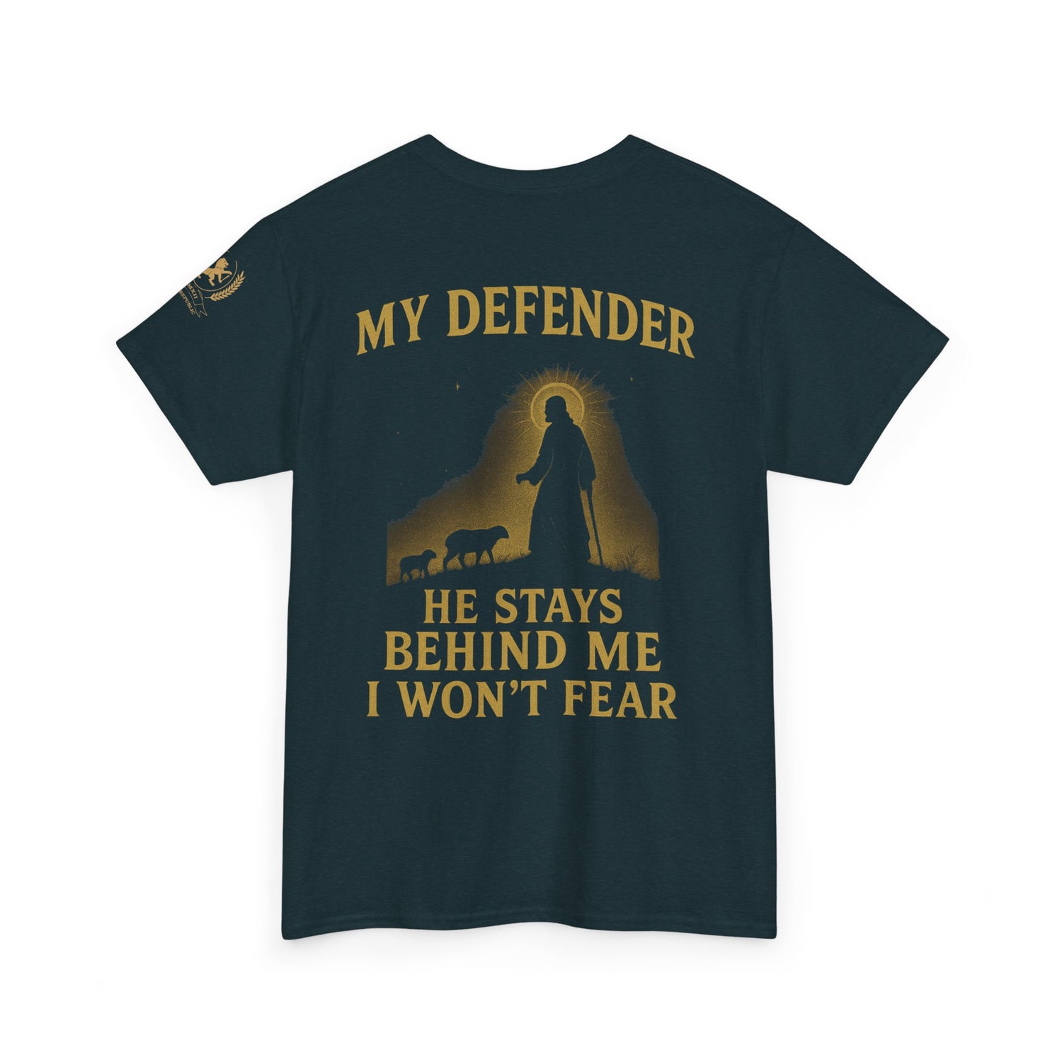 Walk boldly in faith with our “My Defender” Christian T-shirt, inspired by the powerful promise of Psalm 23:4. This faith-based design reminds you and those around you that you are never alone—the Lord stays behind you as your defender, covering your back in every battle.