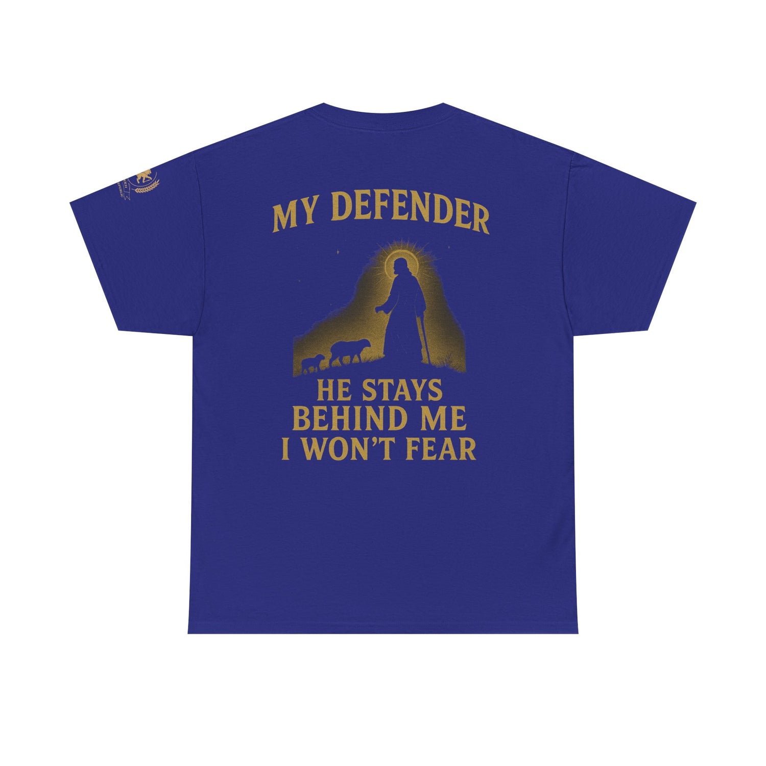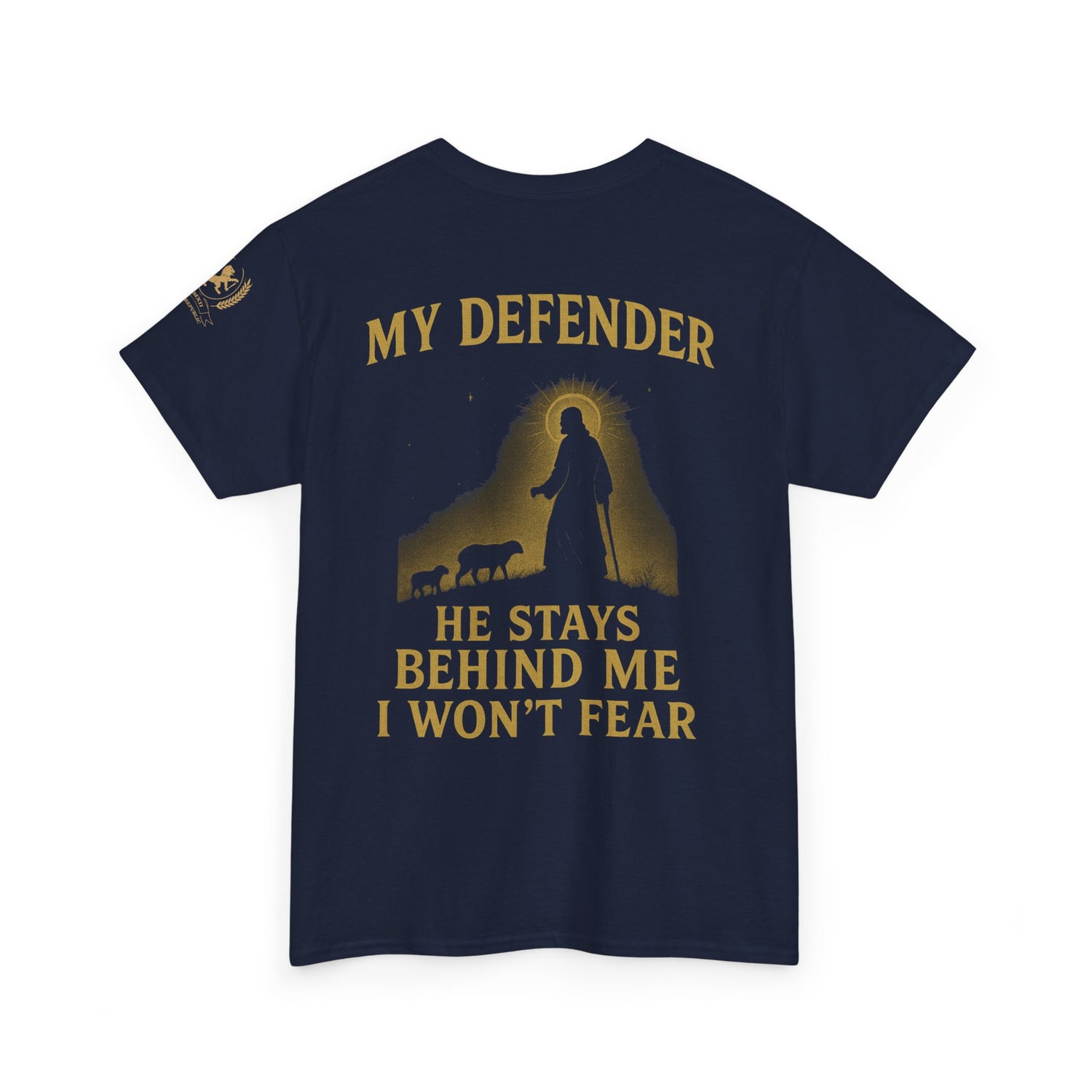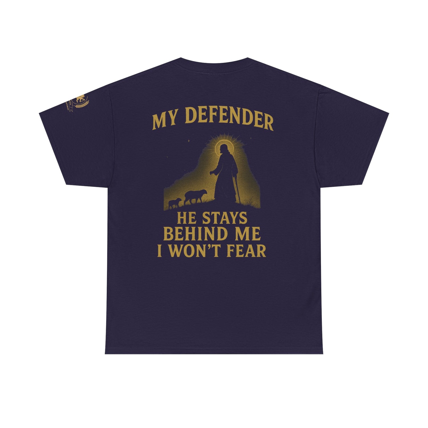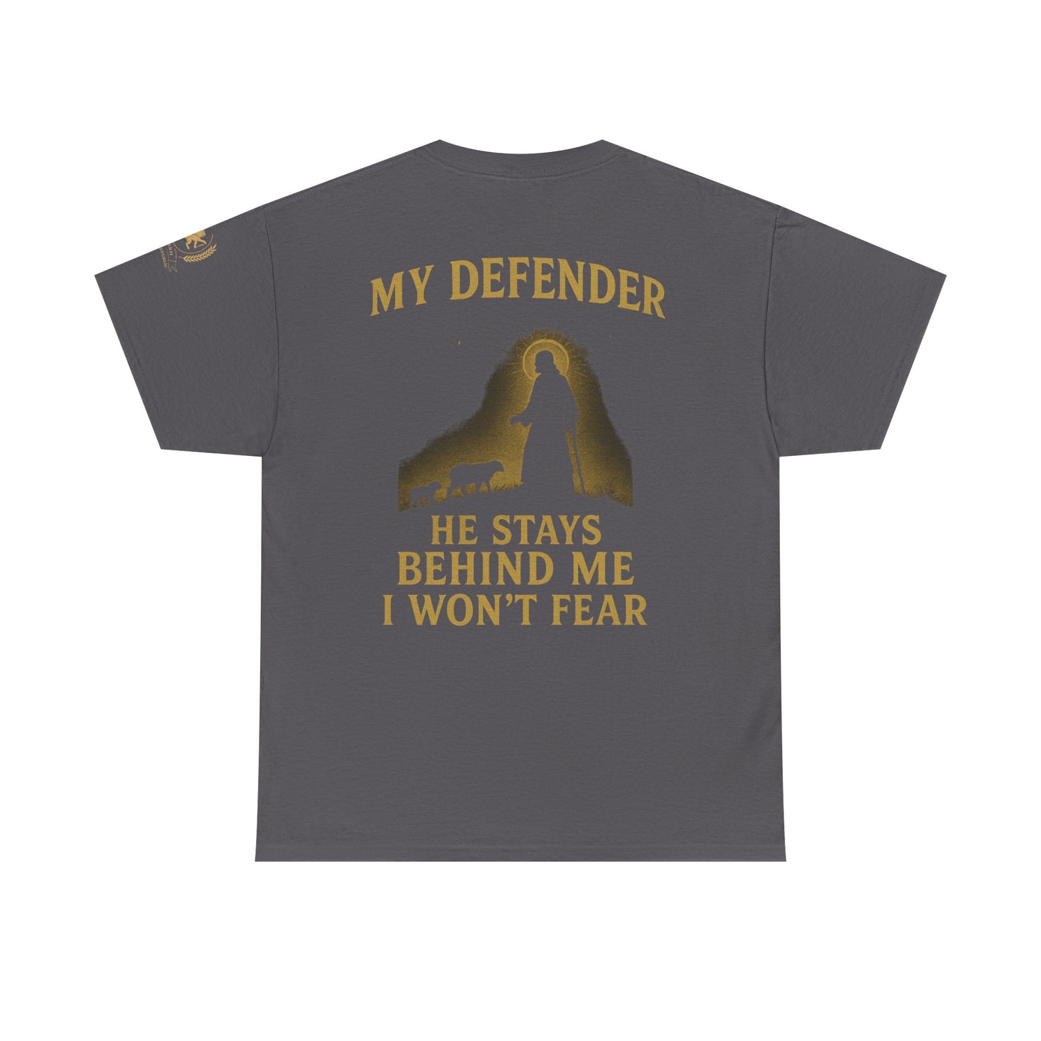 Walk boldly in faith with our “My Defender” Christian T-shirt, inspired by the powerful promise of Psalm 23:4. This faith-based design reminds you and those around you that you are never alone—the Lord stays behind you as your defender, covering your back in every battle.