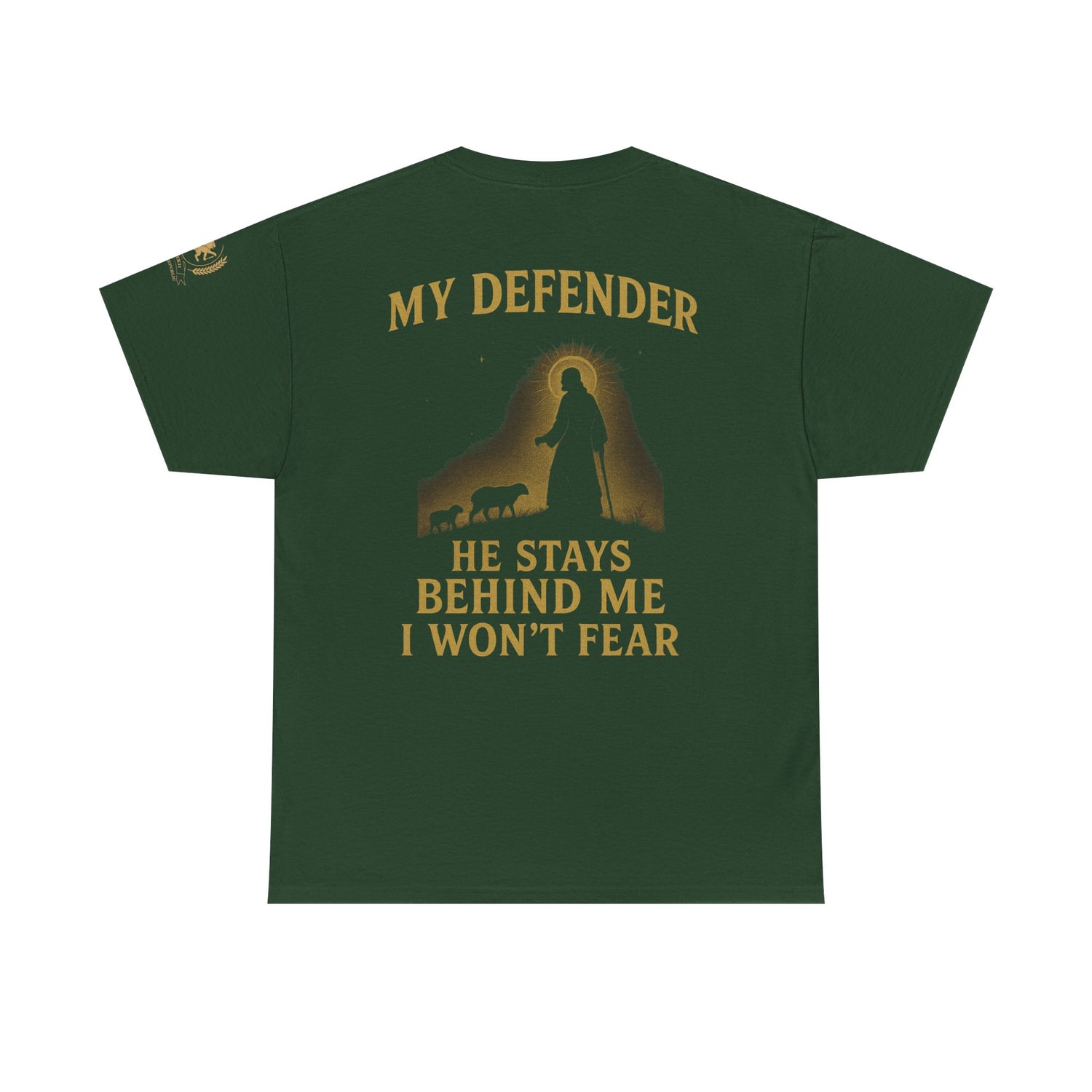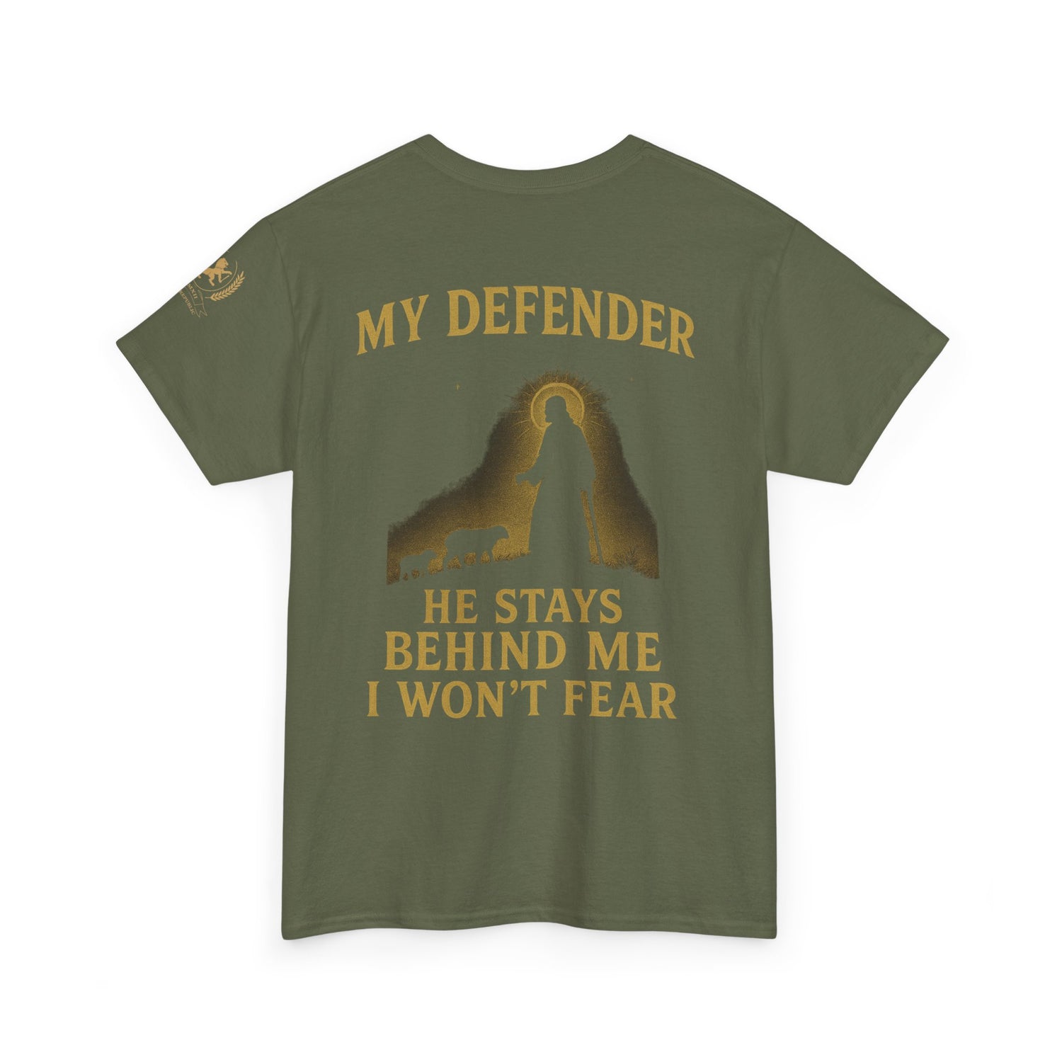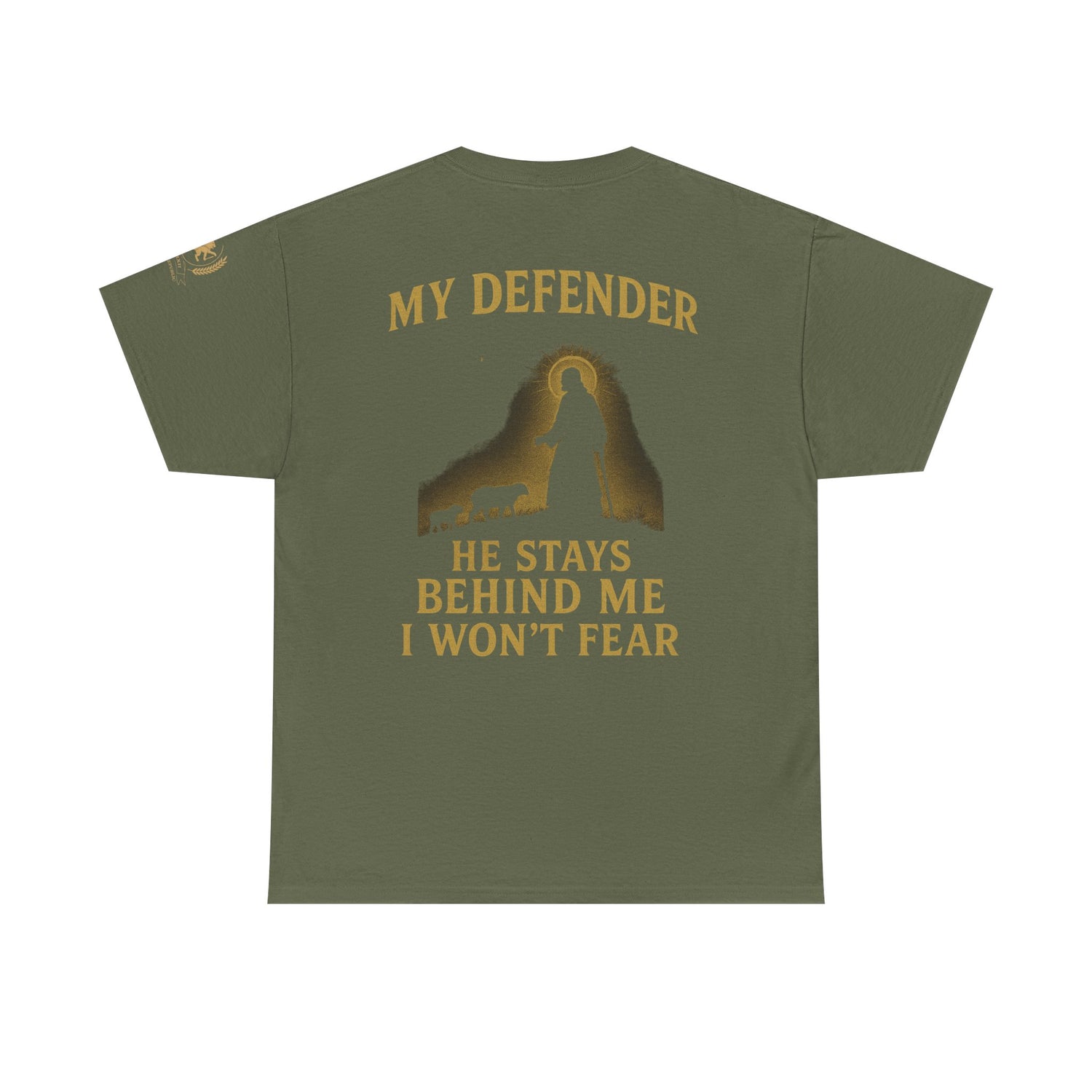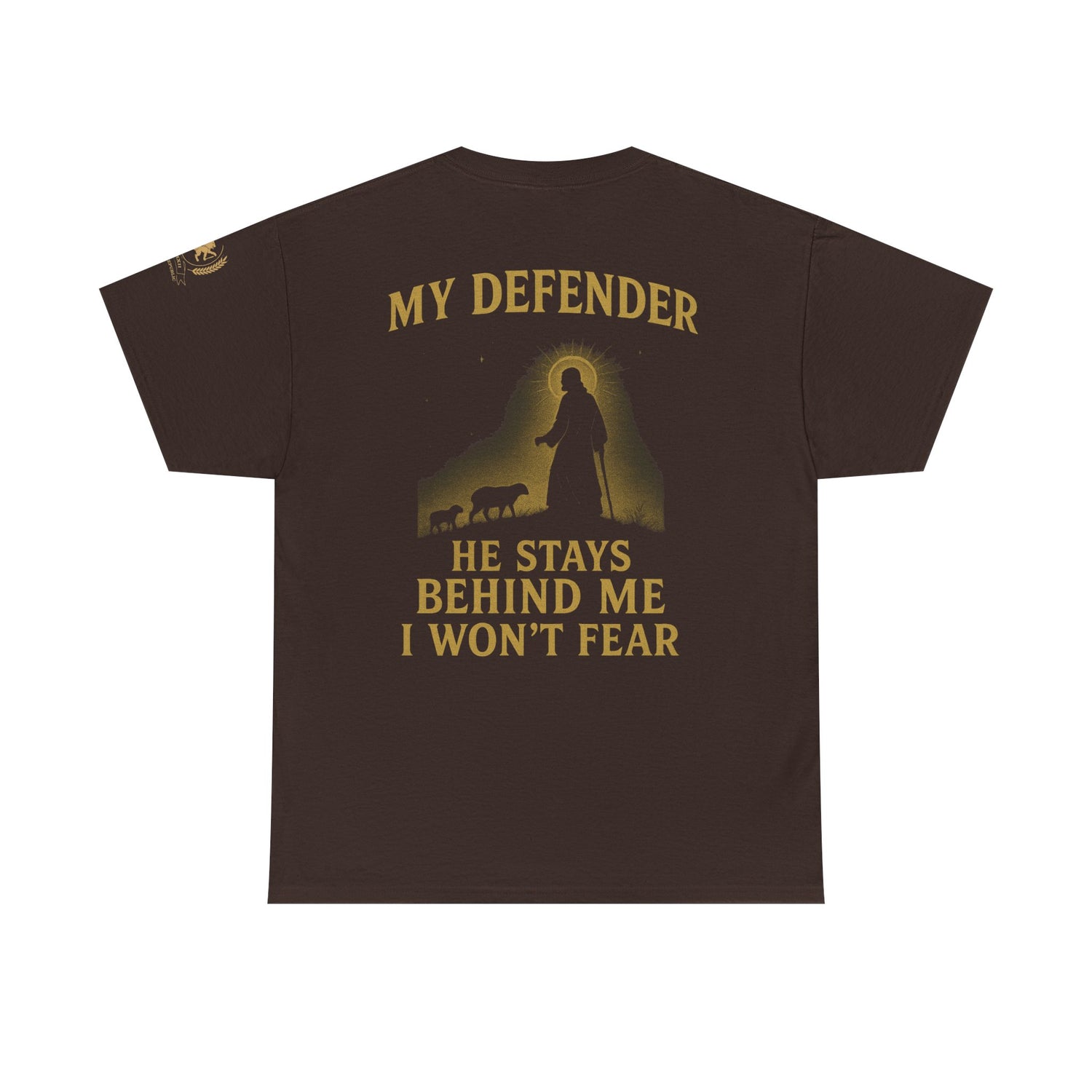 Walk boldly in faith with our “My Defender” Christian T-shirt, inspired by the powerful promise of Psalm 23:4. This faith-based design reminds you and those around you that you are never alone—the Lord stays behind you as your defender, covering your back in every battle.